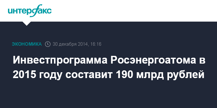 Москва. 30 декабря. INTERFAX.RU - Инвестиционная программа ОАО "Концерн Росэнергоатом" на 2015 год составит порядка 180-190 млрд руб., заявил журналистам глава концерна Евгений Романов. Ранее ожидалось, что инвестпрограмма компании на 2015 год составит 200 млрд рублей.