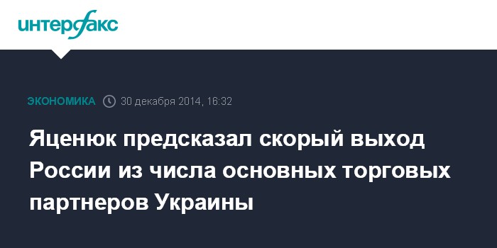"У нас двукратное падение объемов торговли с Россией. Это стало тенденцией, это происходит не первый год и, фактически, в кратчайшей перспективе Россия выйдет из основных торговых партнеров Украины", - сказал Яценюк в ходе итоговой пресс-конференции в Киеве во вторник.
