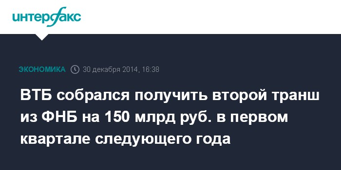 Москва. 30 декабря. INTERFAX.RU – ВТБ подтвердил получение первых 100 млрд рублей из Фонда национального благосостояния в виде субординированного депозита, второй транш на 150 млрд рублей ожидается получить до конца первого квартала 2015 года, говорится в сообщении госбанка.