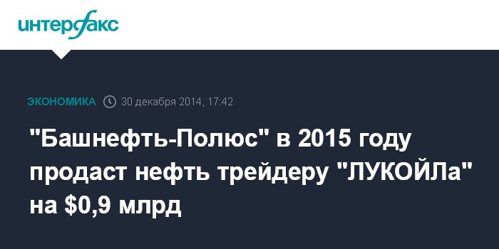 Москва. 30 декабря. INTERFAX.RU – "Башнефть-Полюс" (СП "Башнефти" и "ЛУКОЙЛа", осваивающее месторождения им.Требса и им.Титова) заключило сделку о поставке нефти в 2015 года на сумму до $898 млн в адрес Litasco (международный трейдер "ЛУКОЙЛа"), говорится в сообщении "Башнефти".