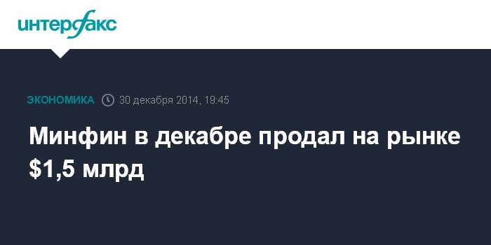Москва. 30 декабря. INTERFAX.RU - Минфин в декабре в целях стабилизации ситуации на валютном рынке по договоренности с ЦБ продал валюту на $1,5 млрд, сообщил глава ведомства Антон Силуанов в интервью телеканалу "Россия 24".