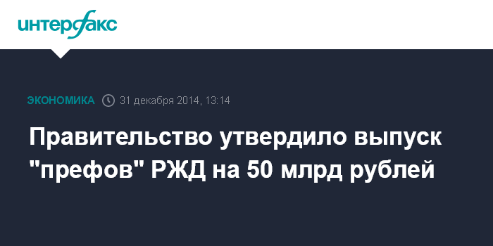 РЖД в свою очередь сообщили, что на заседании 30 декабря совет директоров компании также утвердил решение о дополнительном выпуске "префов" компании на 50 млрд рублей, размещенных по закрытой подписке в пользу единственного акционера - РФ "в лице правительства".