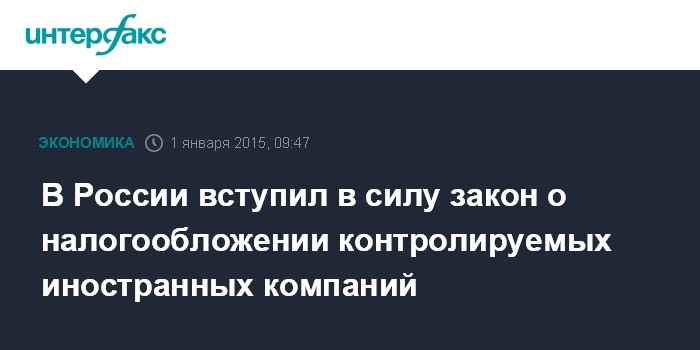 Москва. 1 января. INTERFAX.RU - В России с 1 января 2015 года вступил в силу закон, определяющий механизм налогообложения прибыли контролируемых иностранных компаний (КИК) и доходов иностранных организаций. Г