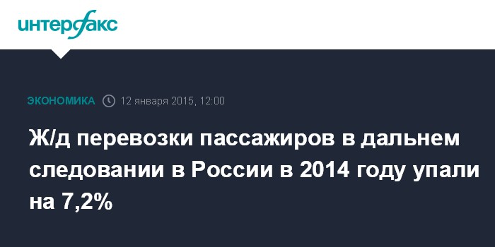 Москва. 12 января. INTERFAX.RU - Перевозки пассажиров в поездах дальнего следования в России в 2014 году сократились на 7,2%, до 102,8 млн человек, в пригородном сообщении - на 0,3%, до 965,5 млн, сообщила пресс-служба РЖД.