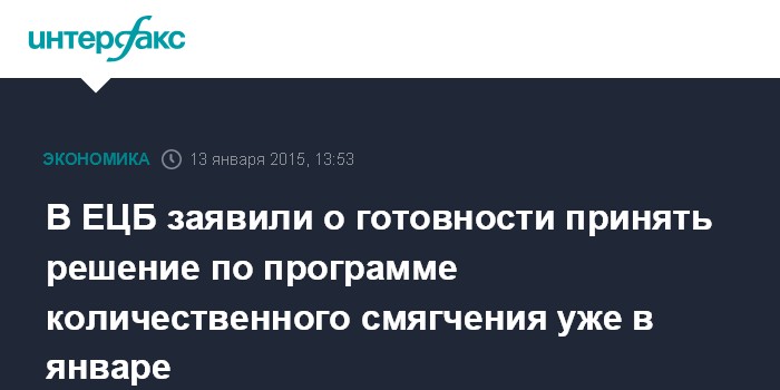 Москва. 13 января. INTERFAX.RU – Европейский центральный банк готов принять решение по программе количественного смягчения (QE) для еврозоны, предусматривающей покупку гособлигаций, на январском заседании, заявил член правления ЕЦБ Бенуа Кёре в интервью газете Die Welt. При этом он подчеркнул, что его слова не означают, что решение действительно будет принято.