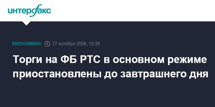 Москва. 27 октября. INTERFAX.RU - Торги на рынке акций ФБ РТС в основном режиме приостановлены до 28 октября 2008 года или до распоряжения ФСФР России; при этом сохраняется возможность заключения переговорных сделок, в том числе, сделок репо, говорится в сообщении биржи.