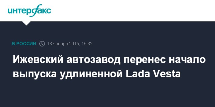 Москва. 13 января. INTERFAX.RU - ОАО "АвтоВАЗ" планирует начать производство удлиненной версии модели Lada Vesta, или Lada C, на Ижевском автозаводе (ООО "ОАГ", входит в группу "АвтоВАЗ") в 2016 году, сообщил во вторник агентству "Интерфакс" источник, знакомый с планами предприятия. Ранее сообщалось, что официальный старт производства модели Lada Vesta на Ижевском автозаводе намечен на 25 сентября 2015 года.