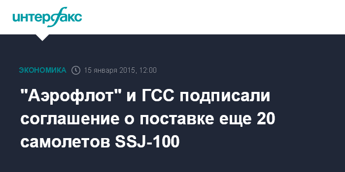 Москва. 15 января. INTERFAX.RU – "Аэрофлот" и "Гражданские самолеты Сухого" подписали соглашение о поставке авиакомпании еще 20 самолетов SSJ-100. Меморандум о намерениях подписали в четверг гендиректор авиаперевозчика Виталий Савельев и председатель совета директоров ГСС Михаил Погосян.