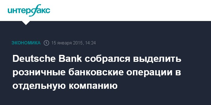 Москва. 15 января. INTERFAX.RU - Deutsche Bank рассматривает возможность выделения розничных банковских операций в отдельную компанию, пишет газета Financial Times. Регуляторы требуют от германского банка сократить долговую нагрузку, а также перестать использовать потребительские депозиты для финансирования операций инвестбанка.
