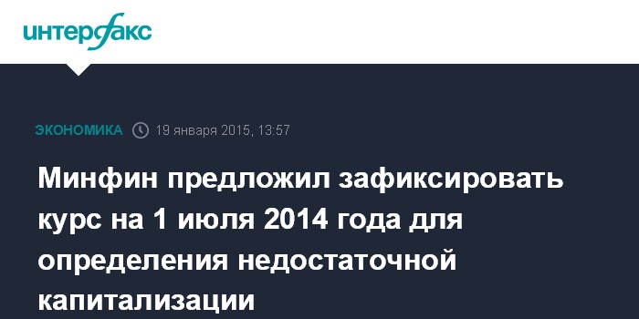 Москва. 19 января. INTERFAX.RU – Минфин России предлагает при определении недостаточной капитализации компаний на 2015 год зафиксировать курс доллара на 1 июля 2014 года, сообщил "Интерфаксу" замминистра финансов Сергей Шаталов.