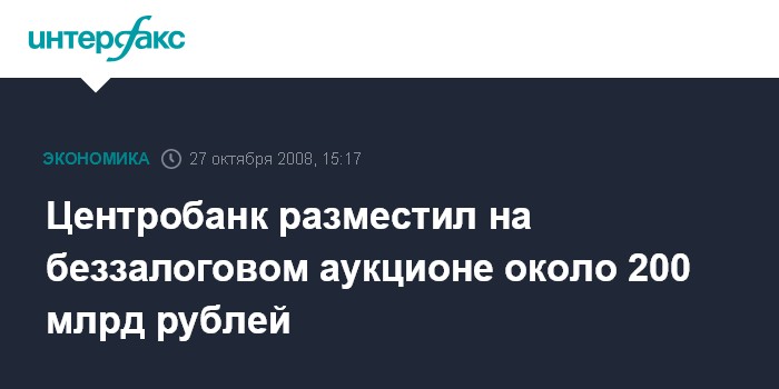 Москва. 27 октября. INTERFAX.RU - Центробанк РФ на беззалоговом аукционе в понедельник разместил около 200 млрд руб., заявил глава ЦБ Сергей Игнатьев, отвечая на вопрос премьер-министра РФ Владимира Путина в ходе заседания правительства.