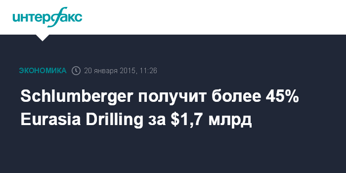 Москва. 20 января. INTERFAX.RU - Schlumberger может получить 45,65% нефтесервисной Eurasia Drilling Company (EDC) за $1,7 млрд, говорится в сообщении EDC.