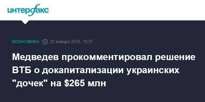 Москва. 20 января. INTERFAX.RU – Решение ВТБ о докапитализации своих дочерних структур на Украине является одной из форм поддержки экономики Киева, хотя по этому вопросу есть разные решения, заявил премьер-министр РФ Дмитрий Медведев.
