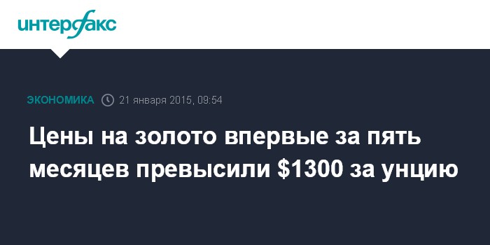 Москва. 21 января. INTERFAX.RU – Цены на золото на мировых рынках превысили $1300 за тройскую унцию впервые с августа 2014 года, поскольку стагнация в мировой экономике повышает спрос на этот металл в качестве защитного актива, сообщает агентство Bloomberg.