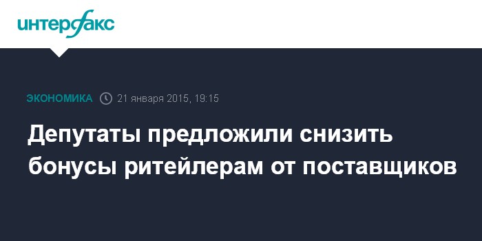 Москва. 21 января. INTERFAX.RU - Парламентарии предлагают ограничить размер вознаграждения, которое поставщики выплачивают ритейлерам, на уровне 3% от чистой стоимости товаров и сократить сроки оплаты за полученный товар.
