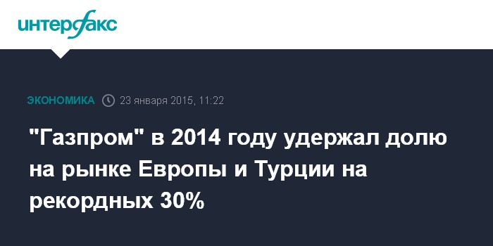 Москва. 23 января. INTERFAX.RU – Доля российского газа на рынке дальнего зарубежья (Европа и Турция) по итогам 2014 года сохранилась на уровне 2013 года - 29,7%, свидетельствуют расчеты "Интерфакса".