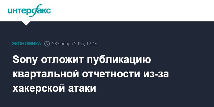 Москва. 23 января. INTERFAX.RU – Sony Corp. обратится к регуляторам с просьбой отложить публикацию финансовой отчетности за третий квартал текущего финансового года (завершился 31 декабря) из-за хакерской атаки на киностудию Sony Pictures, сообщает агентство Bloomberg.