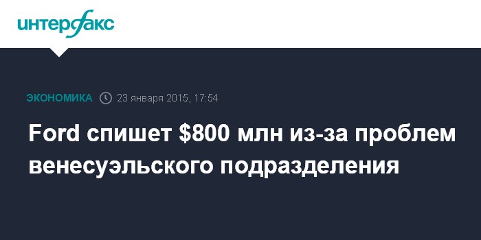 Москва. 23 января. INTERFAX.RU - Американский автопроизводитель Ford Motor сообщил, что его результаты за четвертый квартал 2014 года будут включать в себя единовременное списание на сумму $800 млн до уплаты налогов в связи с исключением венесуэльских операций из консолидированной отчетности.