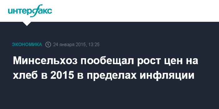 Москва. 24 января. INTERFAX.RU - Рост цен на хлеб в России в 2015 году будет на уровне продовольственной инфляции, считают в Минсельхозе.