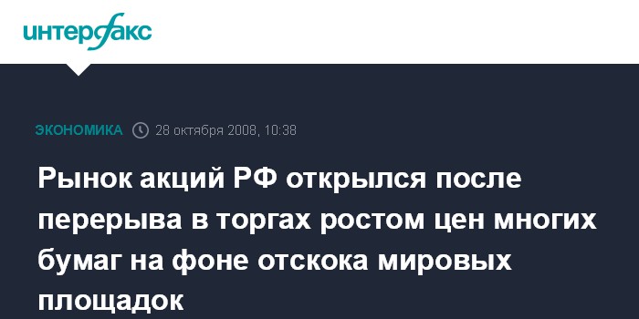 Москва. 28 октября. INTERFAX.RU - Российский рынок акций открылся во вторник после перерыва в торгах ростом цен многих blue chips следом за отскоком мировых фондовых площадок вверх, а также на фоне подорожавшей нефти.