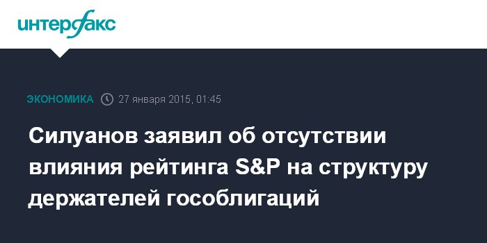 Москва. 27 января. INTERFAX.RU - Министр финансов РФ Антон Силуанов не ожидает резкого снижения доли нерезидентов в структуре держателей облигаций федерального займа (ОФЗ) в связи с понижением международным рейтинговым агентством Standard & Poor's (S&P) долгосрочного и краткосрочного рейтингов Российской Федерации по обязательствам в иностранной валюте до неинвестиционного (спекулятивного) уровня - до "BB+/B" с "BBB-/A-3".