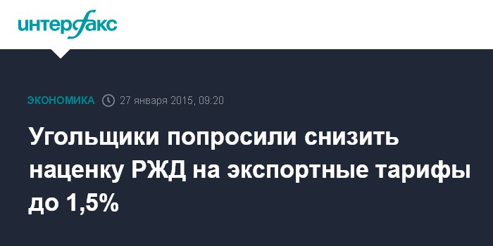 Москва. 27 января. INTERFAX.RU - Угольные компании предлагают повысить экспортные железнодорожные тарифы не на 13,4%, как это сделали РЖД, а на 1,5%, пишут во вторник "Ведомости" со ссылкой на источник в одной из угледобывающих компаний.