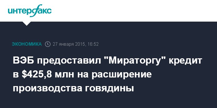 Москва. 27 января. INTERFAX.RU – Внешэкономбанк и "Брянская мясная компания" (входит в АПХ "Мираторг") подписали кредитное соглашение на сумму в $425,8 млн на 15 лет в рамках проекта по увеличению производства высококачественной говядины, сообщается в пресс-релизе агрохолдинга.