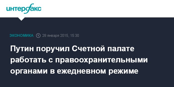 Москва. 28 января. INTERFAX.RU - Президент Владимир Путин поручил Счетной палате наладить ежедневное взаимодействие с правоохранительными органами. "Нужно наладить эффективную постоянную работу, плотную, просто в ежедневном режиме, с правоохранительными органами", - заявил он, выступая на коллегии Счетной палаты.