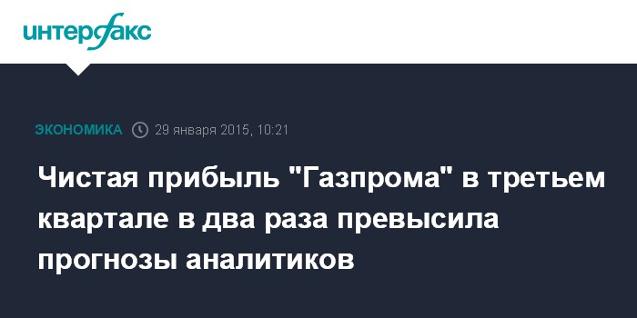 Москва. 29 января. INTERFAX.RU – Чистая прибыль "Газпрома" по международным стандартам в третьем квартале 2014 года упала по сравнению с июлем-сентябрем 2013 года в 2,6 раза - до 105,676 млрд рублей, сообщила компания.