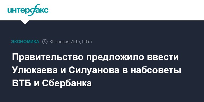 Москва. 30 января. INTERFAX.RU – Правительство предложило ввести министра финансов Антона Силуанова и министра экономического развития Алексея Улюкаева в наблюдательные советы государственных банков, пишут "Ведомости" со ссылкой на нескольких федеральных чиновников.