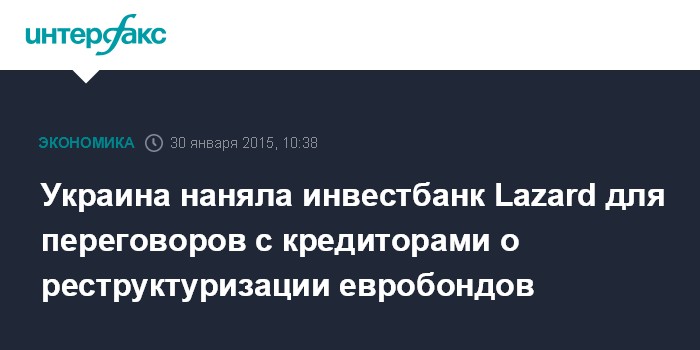 Москва. 30 января. INTERFAX.RU - Украина наняла инвестиционный банк Lazard для помощи в переговорах с зарубежными кредиторами о реструктуризации еврооблигаций на сумму до $20 млрд, сообщает The Wall Street Journal со ссылкой на свои источники.