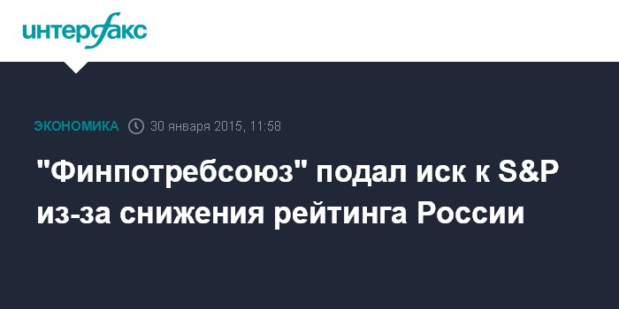 Москва. 30 января. INTERFAX.RU – Общественная организация потребителей "Финпотребсоюз" направила в Пресненский районный суд города Москвы иск к агентству Standard & Poor's Ratings Services о защите прав неопределенного круга лиц в связи с понижением суверенного рейтинга России, говорится в пресс-релизе "Финпотребсоюза". Ответчиком выступает российское представительство.