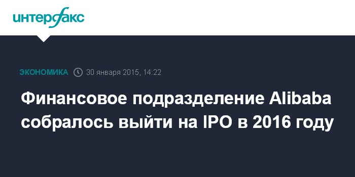 Москва. 30 января. INTERFAX.RU – Финансовое подразделение китайского интернет-гиганта Alibaba Group Holdings может провести первичное размещение акций в следующем году, сообщает агентство Bloomberg со ссылкой на информированные источники.
