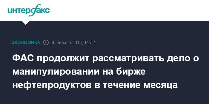 Москва. 30 января. INTERFAX.RU - Федеральная антимонопольная служба РФ продолжит рассматривать дело в отношении ОАО "АНК "Башнефть", ОАО "НК "Роснефть", ОАО "НК "ЛУКОЙЛ" и ООО "ЛУКОЙЛ-Резервнефтепродукт", которые подозревают в манипулировании на бирже нефтепродуктов, сообщил замглавы ФАС Анатолий Голомолзин.