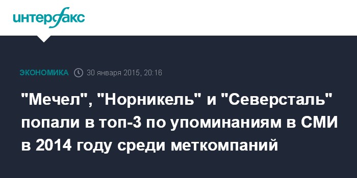 Москва. 30 января. INTERFAX.RU - ОАО "Мечел", ОАО "ГМК "Норильский никель" и ОАО "Северсталь" заняли три первые строчки рейтинга по числу упоминаний в СМИ компаний металлургического сектора в 2014 году, свидетельствуют данные "Системы комплексного анализа новостей" (СКАН), созданной "Интерфаксом".