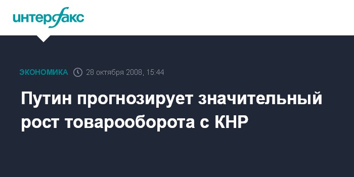 Москва. 28 октября. INTERFAX.RU - Премьер-министр РФ Владимир Путин уверен, что в перспективе Россия и Китай способны значительно повысить уровень товарооборота.