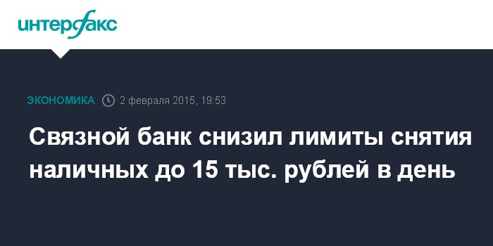 Москва. 2 февраля. INTERFAX.RU - Связной банк с 3 февраля снижает ежедневный лимит снятия наличных денежных средств с карт до 15 тыс. рублей, говорится в сообщении банка.