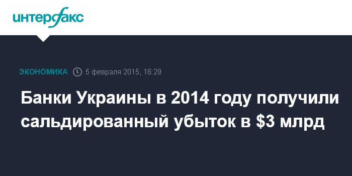 Москва. 5 февраля. INTERFAX.RU – Сальдированный убыток действующих на Украине банков в 2014 году составил 52,966 млрд гривен, тогда как в 2013 году была зафиксирована прибыль в размере 1,436 млрд грн., сообщается на сайте Национального банка Украины.