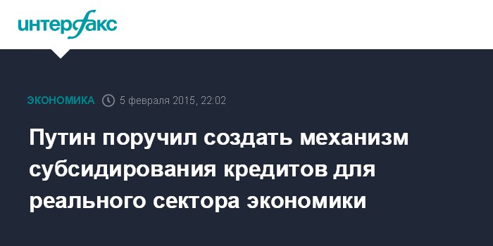 Москва. 5 февраля. INTERFAX.RU - Президент РФ Владимир Путин поручил сформировать механизм, предусматривающий субсидирование кредитов предприятий реального сектора экономики на пополнение оборотных средств и финансирование задолженности.
