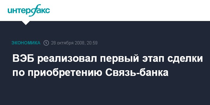 Ранее сообщалось, что договоренность о приобретении ВЭБ 97,9% голосующих акций Связь-банка, испытывавшего финансовые проблемы из-за падения фондового рынка, была достигнута в конце сентября.