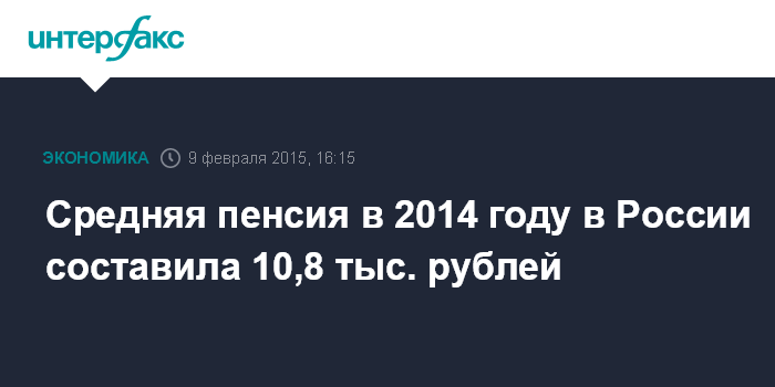 Москва. 9 февраля. INTERFAX.RU – Средний размер пенсии в России в декабре 2014 года по сравнению с декабрем предыдущего года вырос на 8,5% в номинальном выражении и составил 10 тыс. 889 рублей, сообщил Росстат.