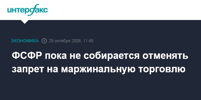 Москва. 29 октября. INTERFAX.RU - Федеральная служба по финансовым рынкам (ФСФР) пока не собирается отменять запрет на маржинальную торговлю, сказал журналистам глава ФСФР Владимир Миловидов. "Короткие позиции запрещены, либерализации по маржинальной торговле не будет", - сказал он, отвечая на вопрос о том, собирается ли ФСФР отменить запрет на маржинальную торговлю.