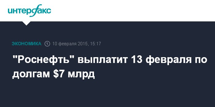 Москва. 10 февраля. INTERFAX.RU – "Роснефть" выплатит 13 февраля по долгам $7 млрд, сообщил журналистам глава компании Игорь Сечин.