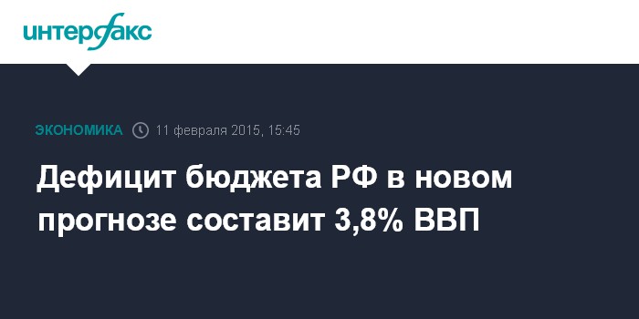 Москва. 11 февраля. INTERFAX.RU – Дефицит бюджета России в 2015 году, по оценке Минэкономразвития, в условиях нового макропрогноза может составить 3,8% ВВП, сообщил журналистам министр экономического развития Алексей Улюкаев по итогам совещания у премьер-министра.