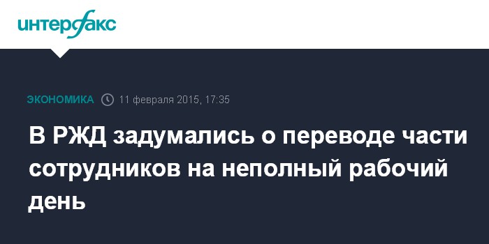 Москва. 11 февраля. INTERFAX.RU – "РЖД" не планирует сокращение штата, но не исключает, что часть сотрудников может быть переведена на неполный рабочий день, , сообщает пресс-служба администрации главы Чувашии со ссылкой на президента РЖД Владимира Якунина.
