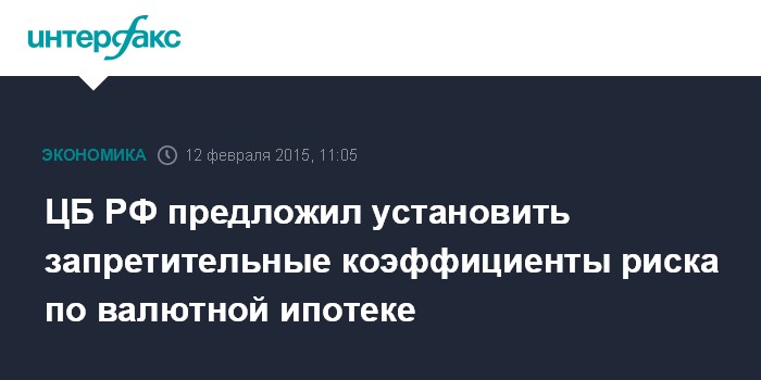 Москва. 12 февраля. INTERFAX.RU - ЦБ РФ предлагает повысить коэффициенты риска при расчете достаточности капитала до 300% с нынешних 150% для валютной ипотеки, выданной после 1 апреля 2015 года, следует из проекта указания регулятора.