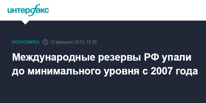 Москва. 12 февраля. INTERFAX.RU - Международные резервы России к 6 февраля сократились до $374,7 млрд, что ниже минимального уровня, до которого они опускались во время кризиса 2008-2009 года ($376,1 млрд на 13 марта 2009 года), следует из информации Банка России.