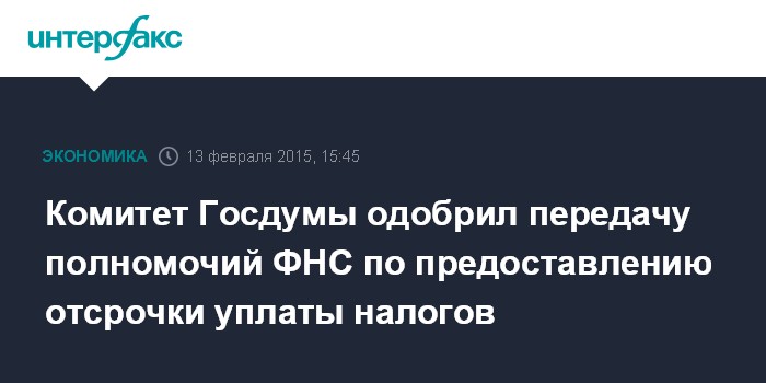 Москва. 13 февраля. INTERFAX.RU – Комитет Госдумы по бюджету и налогам на заседании в пятницу рекомендовал нижней палате парламента принять во втором чтении законопроект о передаче полномочий от правительства Федеральной налоговой службе по предоставлению отсрочки и рассрочки по уплате федеральных налогов на срок от одного года до трех лет.