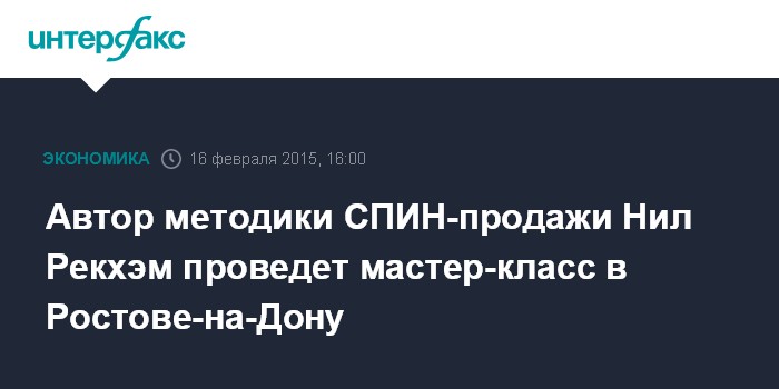 Москва. 16 февраля. INTERFAX.RU - Культовый автор методики СПИН-продажи Нил Рекхэм проведет мастер-класс 21 марта в Ростове-на-Дону в КВЦ "ВертолЭкспо".