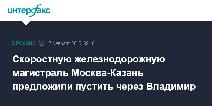 Москва. 17 февраля. INTERFAX.RU - Совет потребителей услуг ОАО "Российские железные дороги" (РЖД) при правительственной комиссии по транспорту рекомендует инициаторам проекта по строительству высокоскоростной магистрали (ВСМ) Москва-Казань дополнительно проработать вопрос прохождения линии через Владимир - для стыковки с другими видами транспорта.